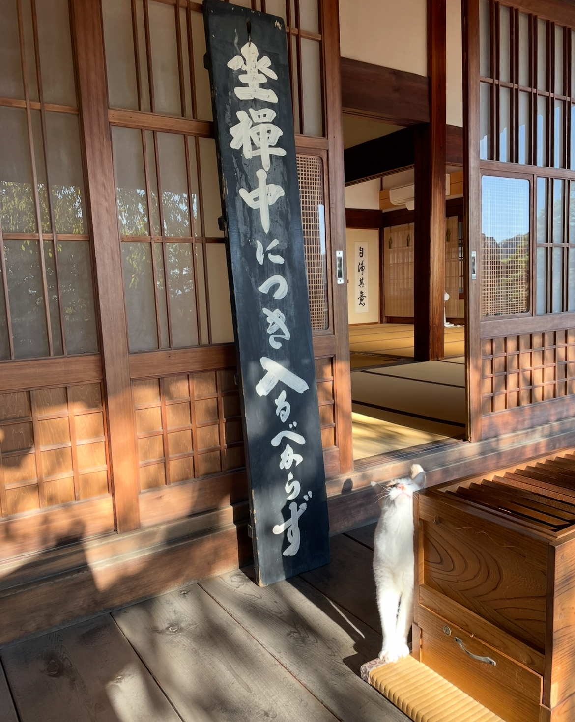 坐禅後にはネコ(福太郎)が上機嫌でやってきました。外で坐禅をしていたのでしょうか。