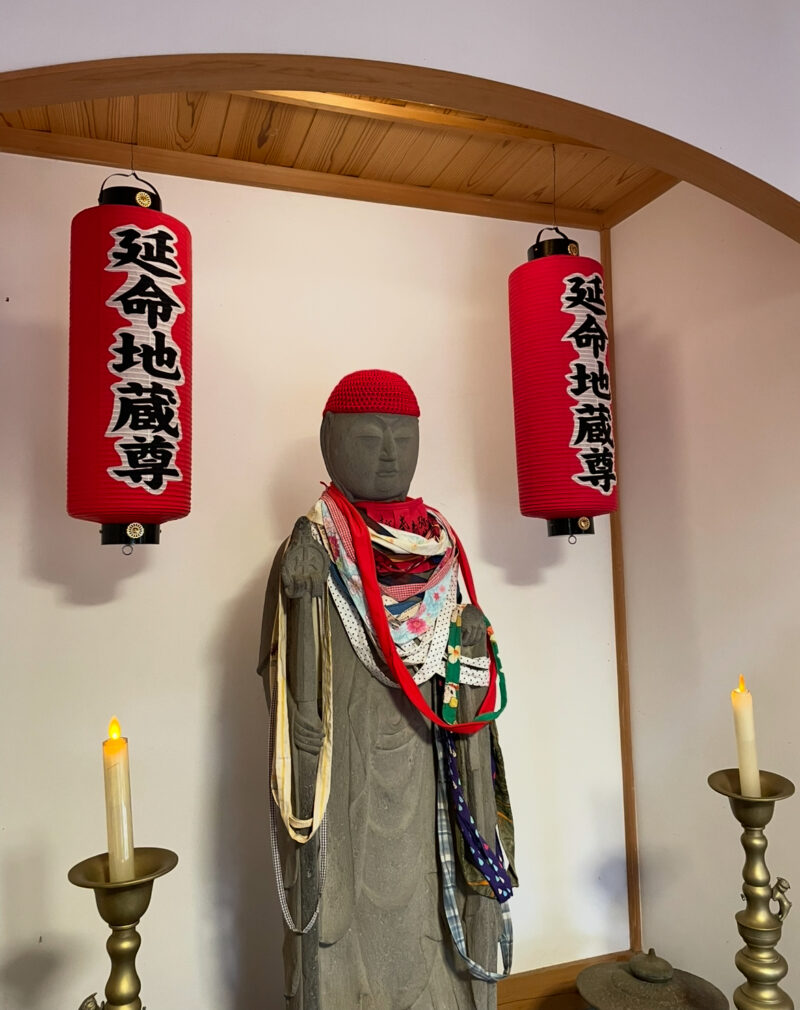 延命地蔵堂のセキ地蔵さんには新しい赤い帽子を作ってもらいました。新品の暖かい帽子で喜んでいるように思えました。