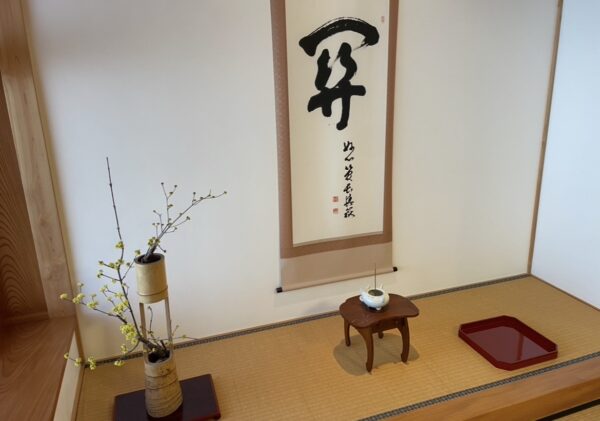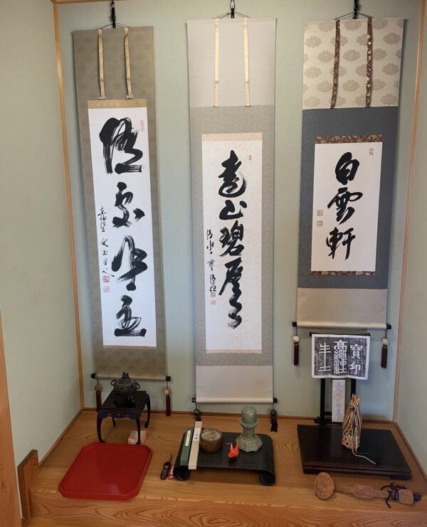 床の間には東福寺派管長更幽軒福島慶道老師のお軸「随処作主」(左)「遠山碧層々」(中央)「白雲軒」(左)